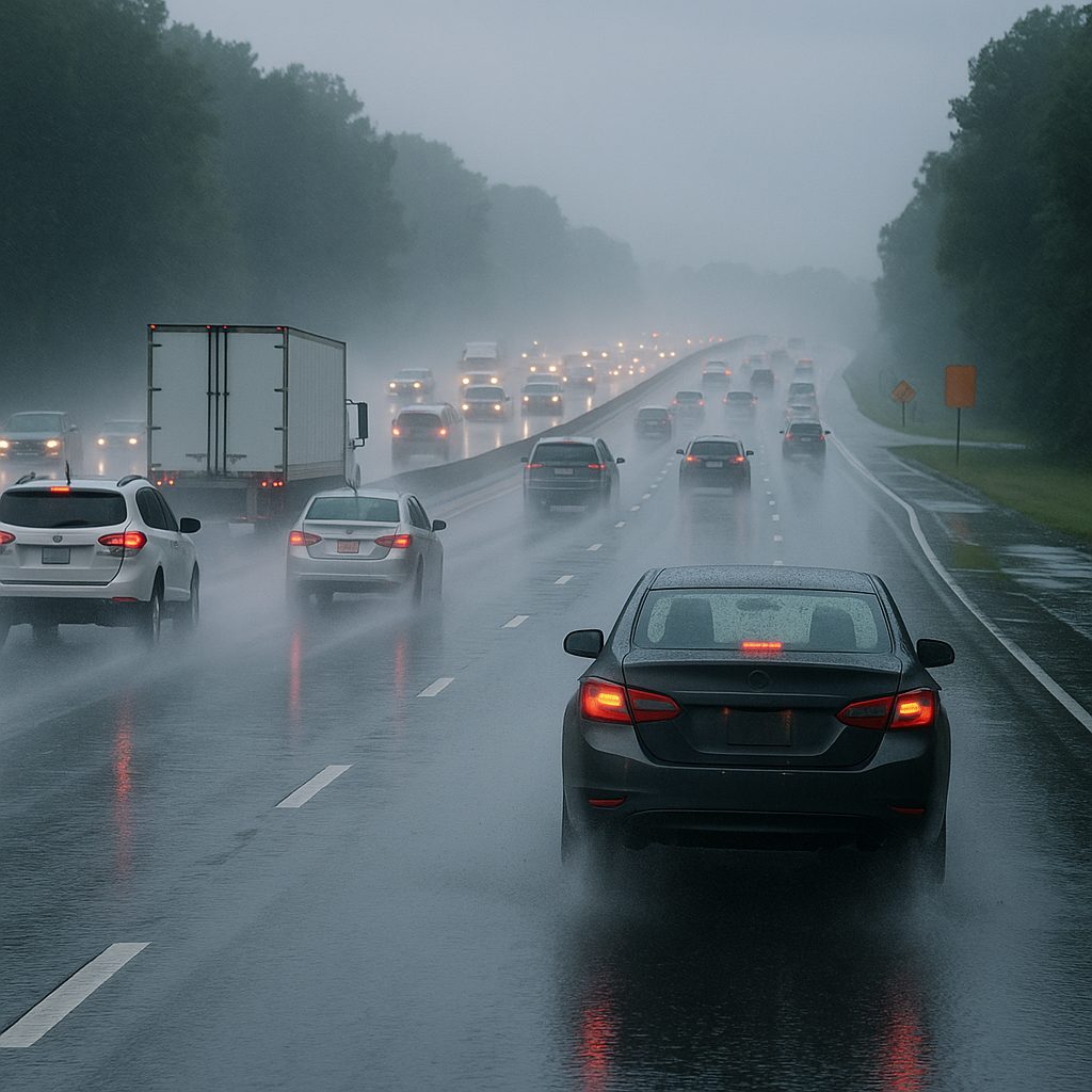 Multi-lane spray reduces visibility; increase distance and use lights.