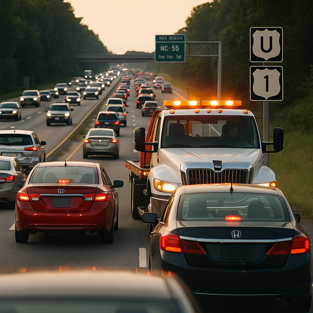 Consider NC-55 or Ten-Ten Rd to clear traffic if the vehicle is drivable.